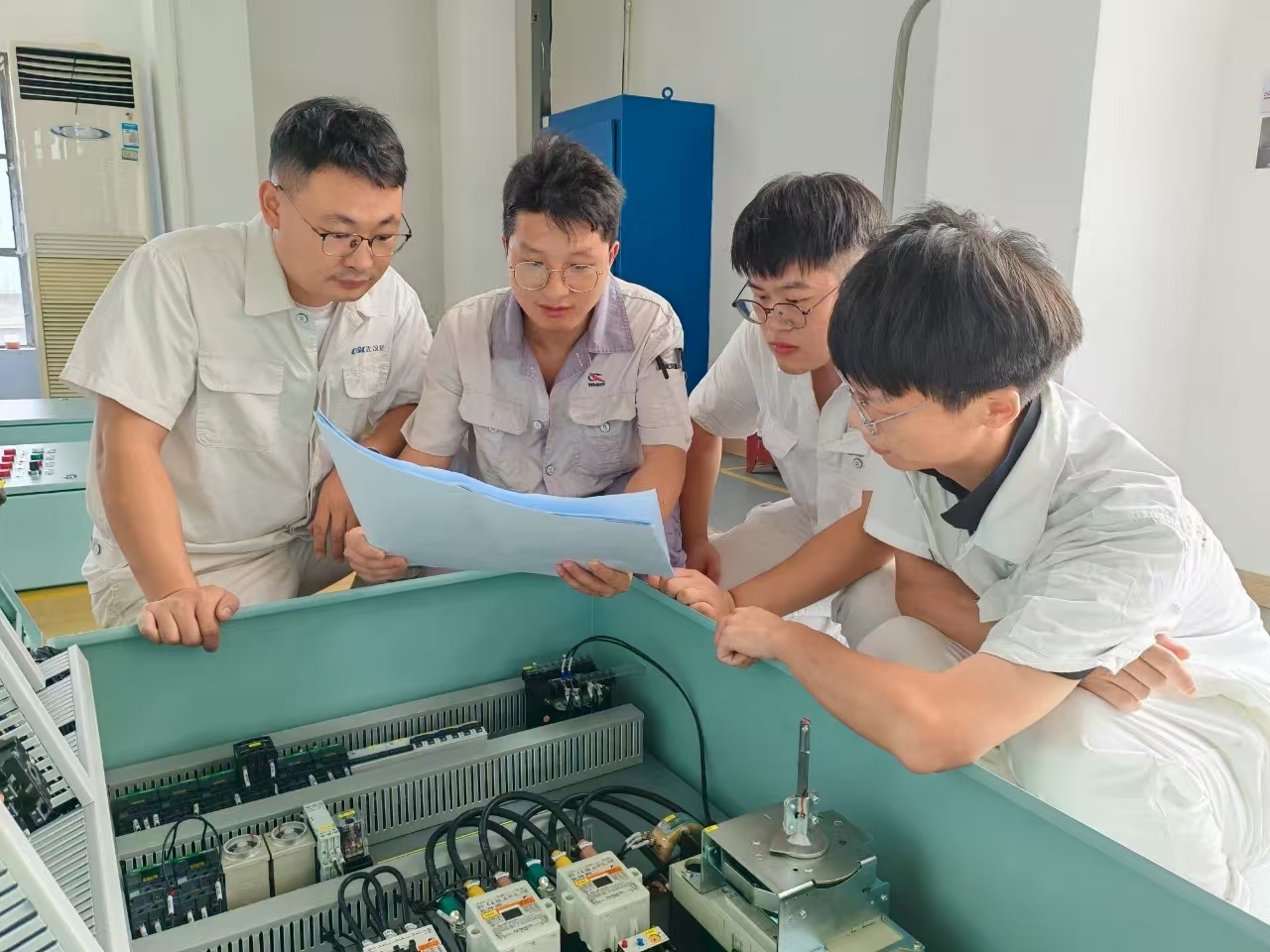 以在制產品為目標,注重培訓過程細節。培訓計劃制訂后,授課老師聚焦產品加工特點,不斷優化調整課件,讓教學更加通俗易懂,提高培訓人員接受度。在幾位高級技師授課內容中,增加了生產現場講解環節,讓青年電工更直觀了解產品布線、接線、調試等知識;技術人員講授理論課程時,均以產品案例為主,讓青年電工更深入掌握基礎知識。培訓結束后,分別開展了理論知識測試和電控柜裝接實操測試,經過檢驗,青工理論水平和實操水平得到一定提升。